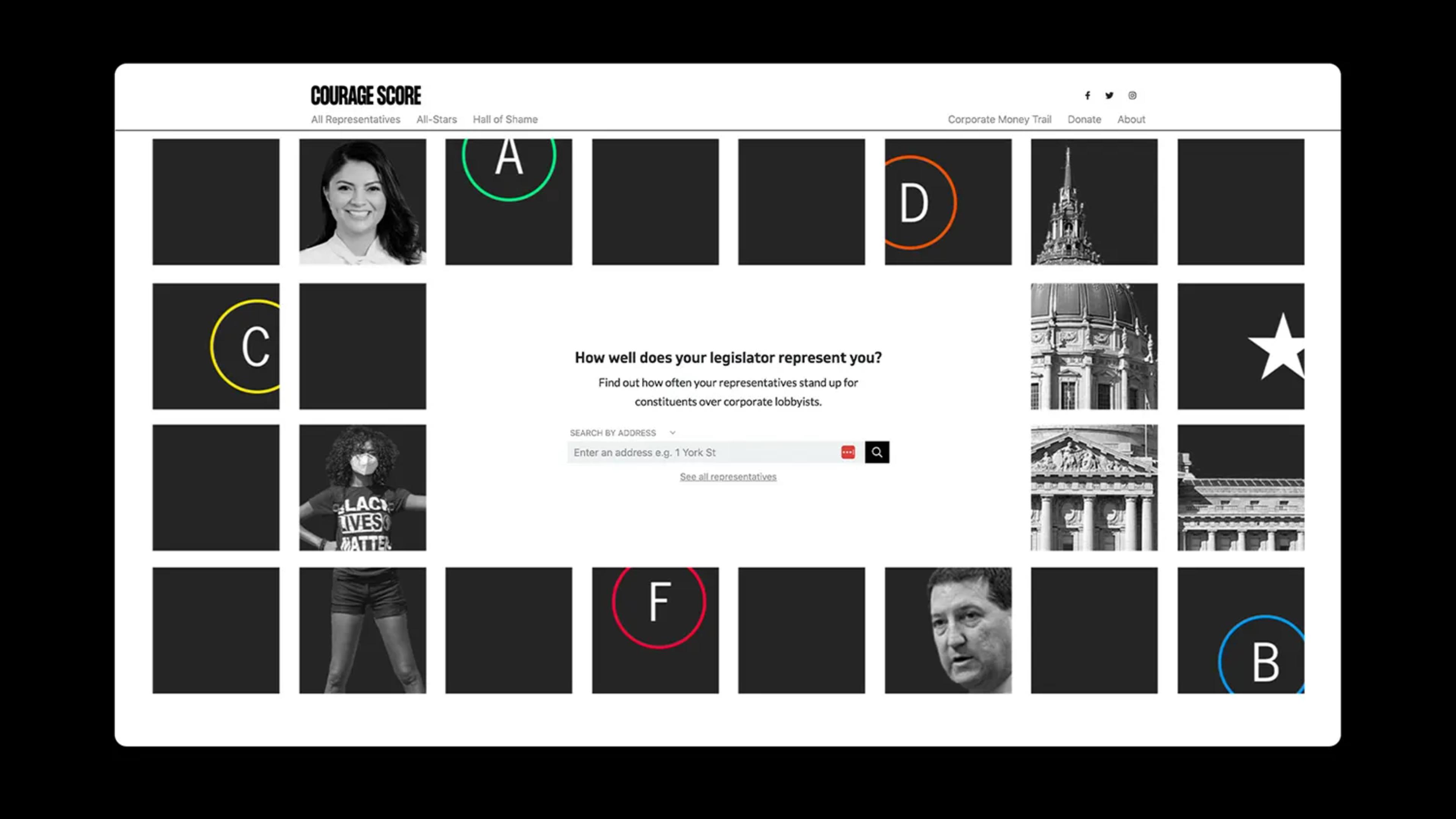 Courage Score works with their progressive partner organizations who provide information on bills, voting records and a wide range of progressive issues to score legislators on. Users are able to explore all of this data in depth to reveal whether their representatives stay true to their constituents.