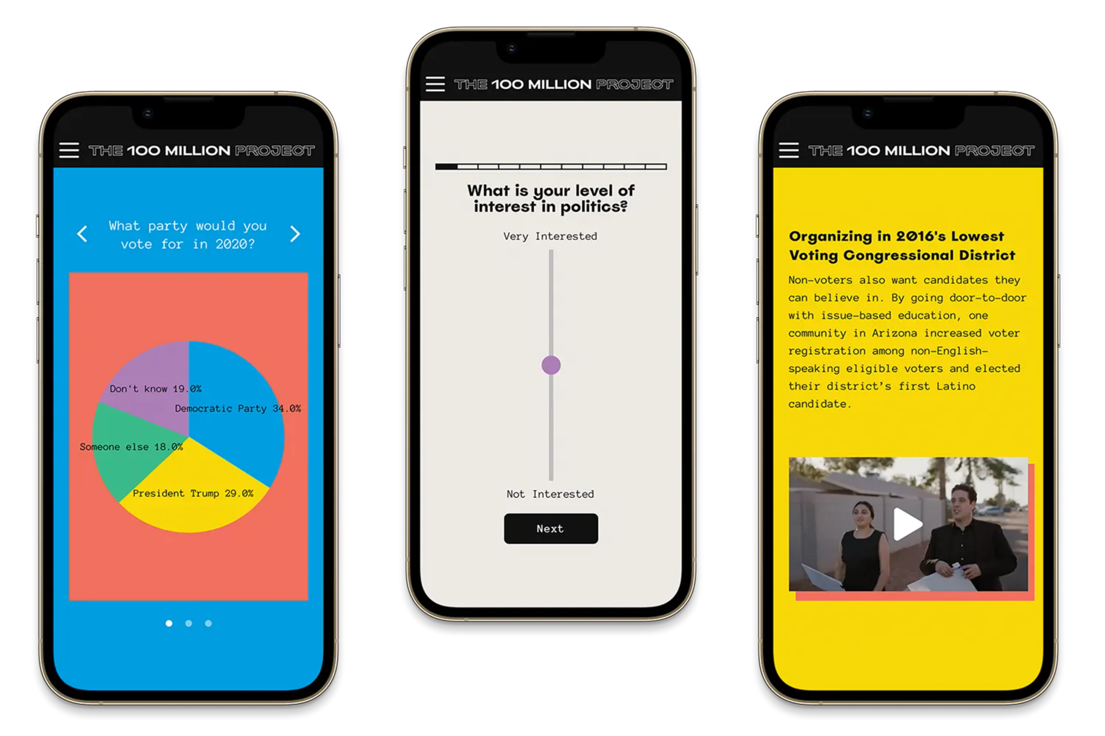 The core of the website is a long-scrolling, animated experience that takes the user through key findings of the study. It uses data points, interactive charts, illustrations and video segments to tell the story of disengaged voters.